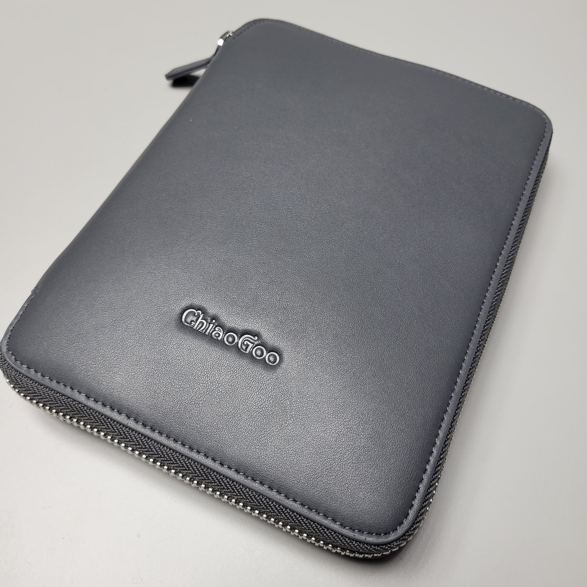 This set includes eight [S] join tips made of an elegant combination of carbon fiber and sleek stainless steel AND six [L] join tips made from blackwood and stainless steel. The set also includes six SWIV360 interchangeable cables and three red [S] TWIST cables. Silver in color, the SWIV360 cables have the same properties as the much-loved red and blue TWIST TM cables PLUS an added swivel feature! The case is just as elegant and functional as the tips and cables. Made of REACH compliant man-made material, the case includes a double-sided, removable needle board that firmly houses all tips; elastic that securely holds but gives easy access to accessories; and four pockets to hold the rest of your knitting supplies.