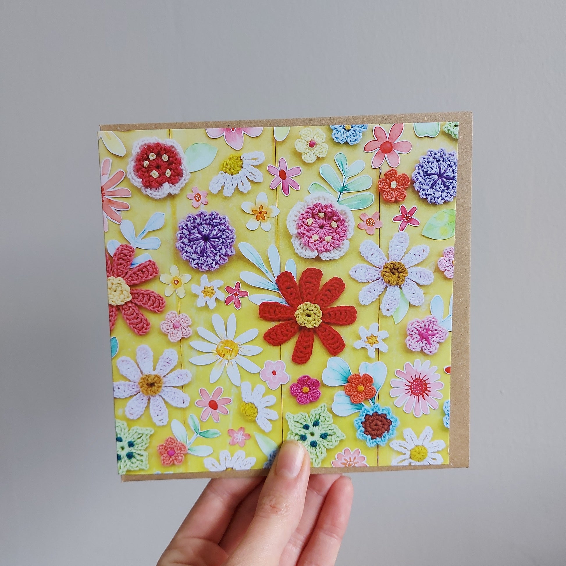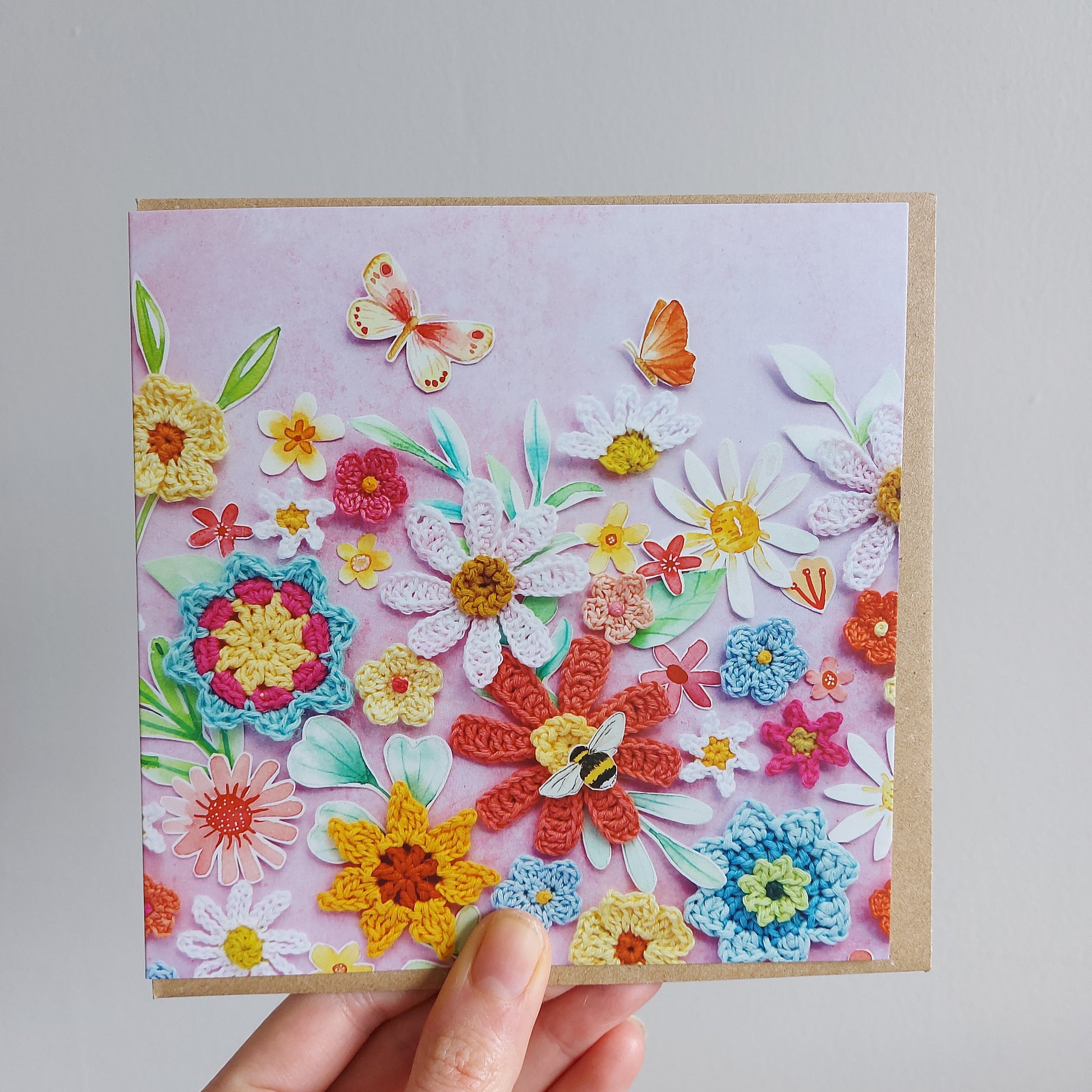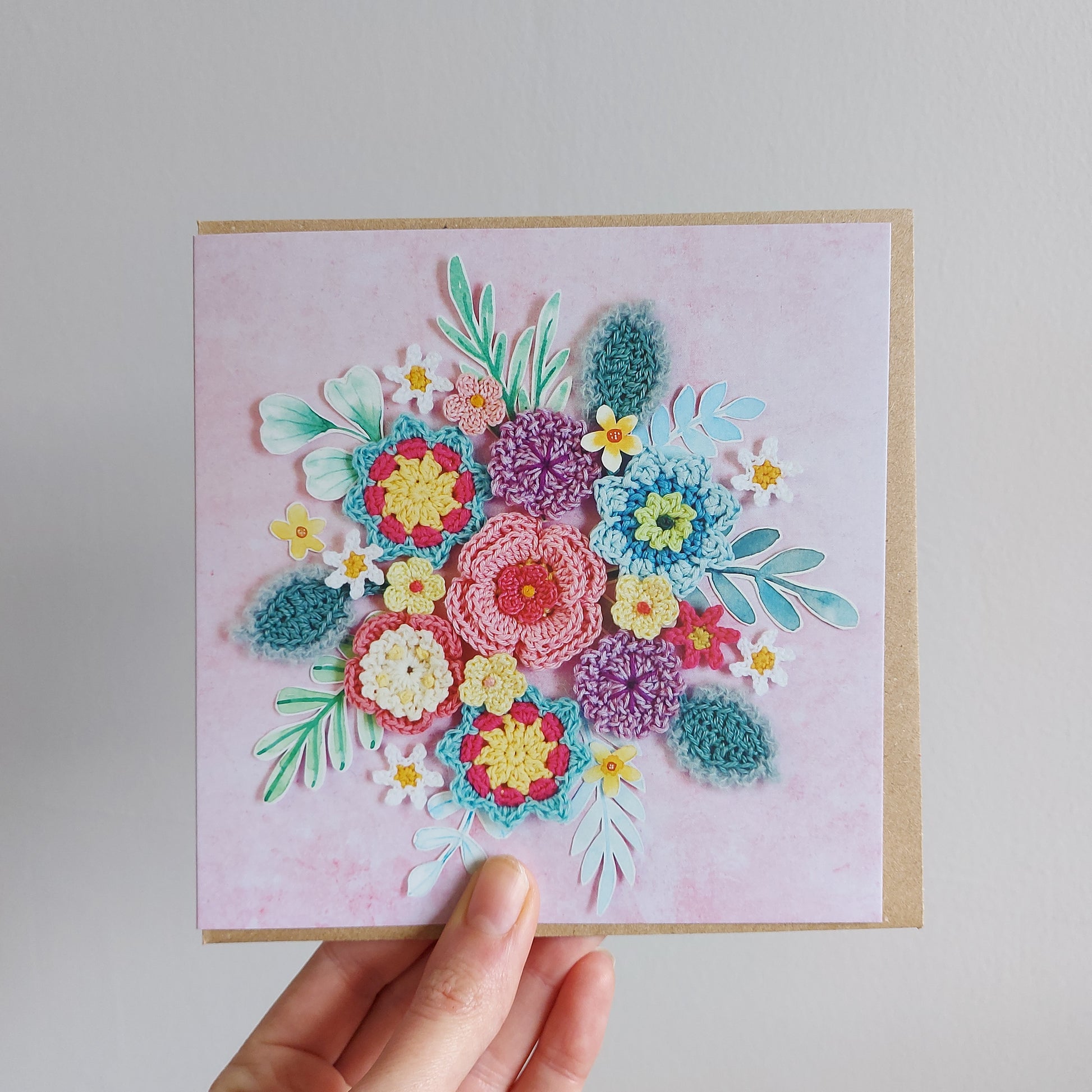 These bright summery designs are a combination of watercolour elements hand painted by English artist Becky Norrington, with crochet flowers and foliage made by her mum, Chris.