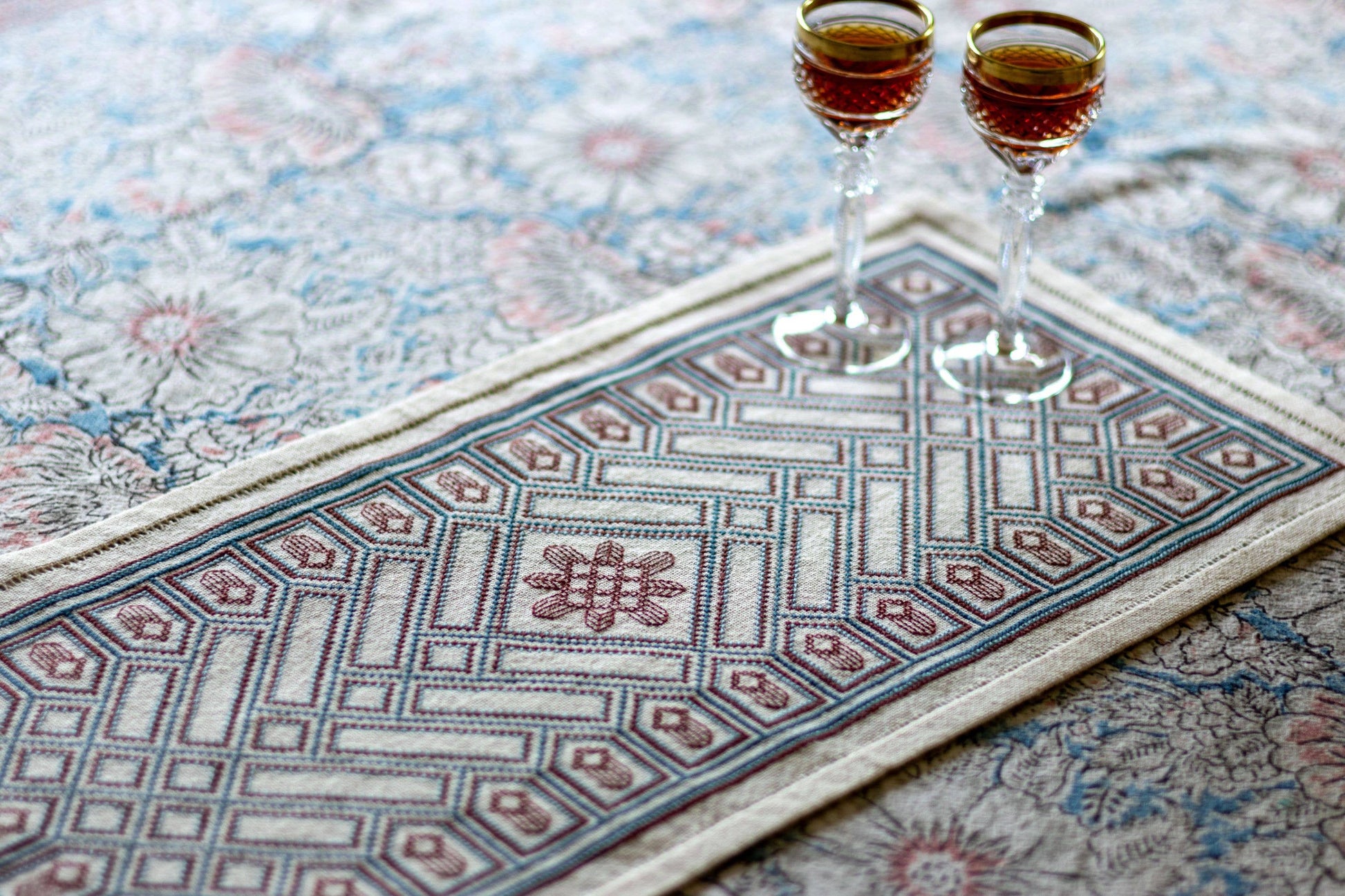 This unique cross stitch kit reimagines the leaded glass windows of Prairie-style architecture in textile form. Delicate starburst motifs are contrasted with strong diagonal lines and worked in a color palette of the same time period proving the ongoing appeal of this aesthetic era.