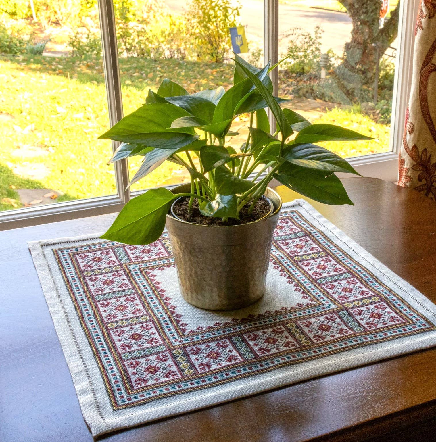 Lavish geometric borders such as these in the Ukrainian Tulips cross stitch kit are often found in folk embroidery of the Ukraine. While traditionally worked in high contrast colors such as red, green, and orange, this in a warmer, more saturated palette is designed to coordinate with modern home interiors.