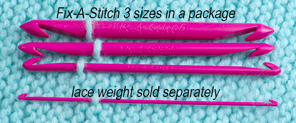 The perfect tool to help pick up dropped stitches! Fix-a-Stitch is available in 4 sizes. This listing is for a 2-pack of the Lace Weight. The Small / Medium / Large come in a 3-pack available here.
