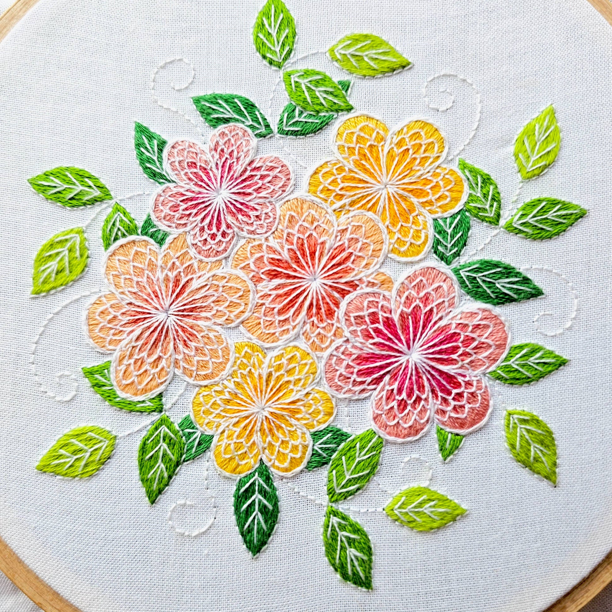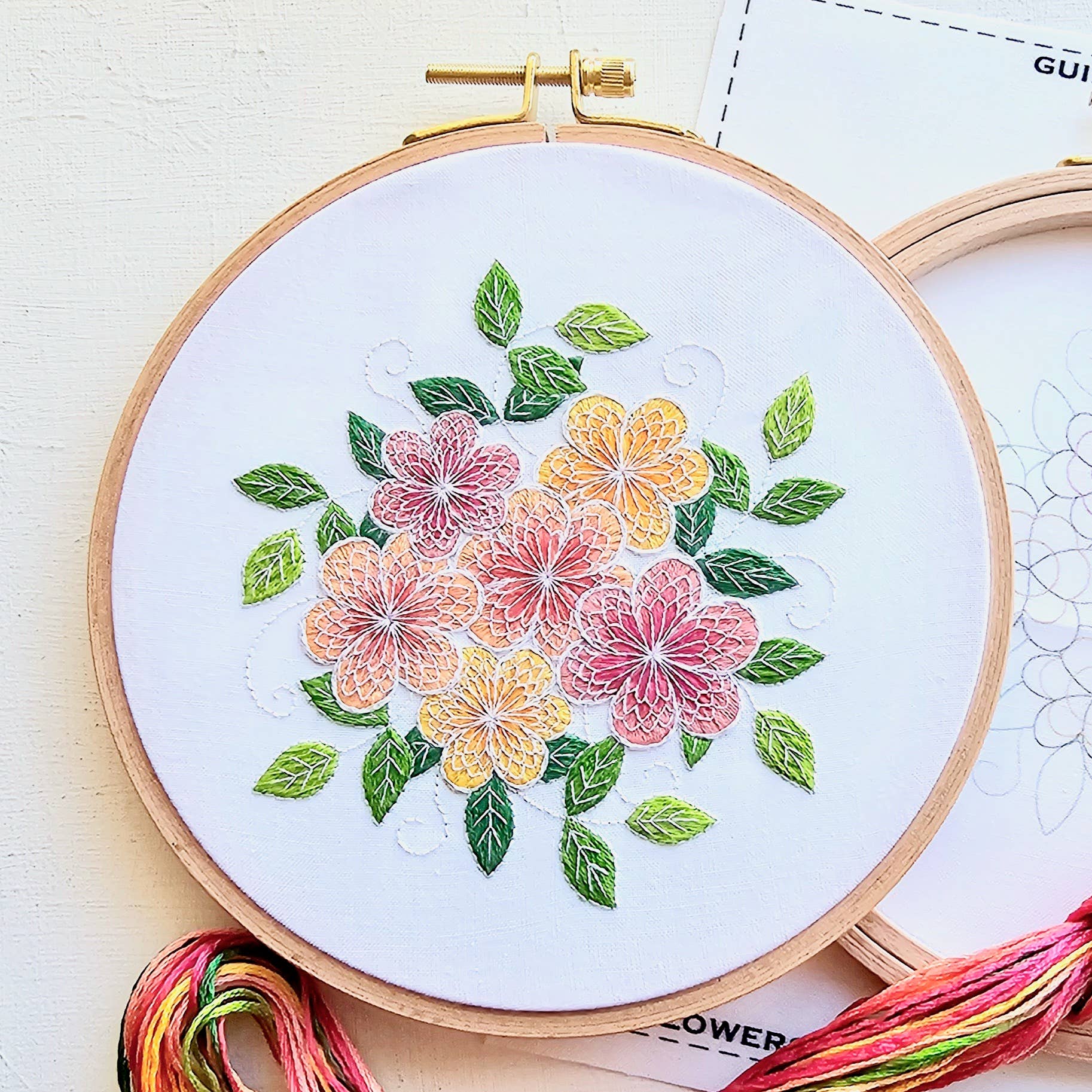This project combines brightly colored thread painted flowers with a combination of delicate white stitches designed to replicate lace. The online video tutorial will guide you as you fill each petal with long and short stitch using a single strand of thread. Stitchers should be comfortable with some improvisation as the lacy stitches are placed on top of this thread painted layer without any guidelines. Beginners can modify the project by filling the petals with split stitch using a single color of thread and by skipping the petal lace.