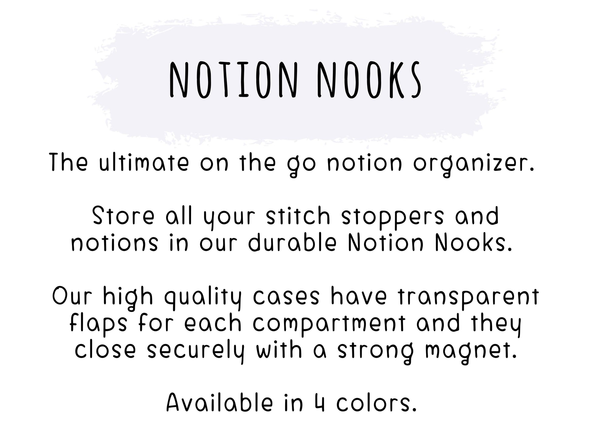 Our Notion Nooks are the ultimate on the go notion organizer. You'll never want to leave home without it! Store and proudly display all of your stitch stoppers, notions and tools in our portable & durable hard plastic containers. Perfect to throw in your project bag and take with you wherever your craft projects go. Our high quality cases have transparent flaps for each compartment so you can see your collection of notions while keeping them organized in separate sections. The cases close securely with a strong magnet.